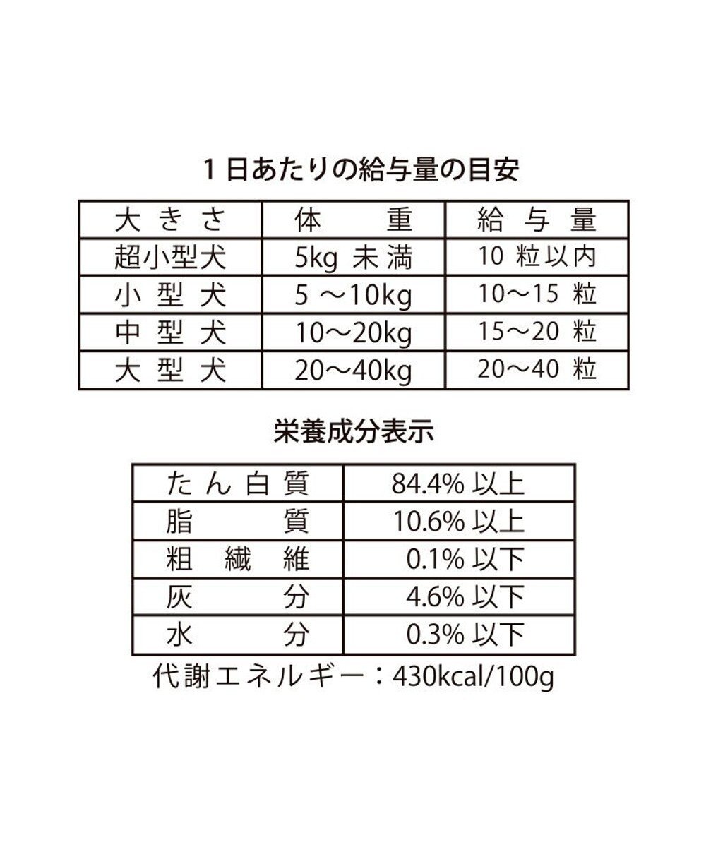 ・そのまま与えると愛犬の食べ方や習性によっては、のどに詰まらせる恐れがありますので、必ず観察しながら与えてください。