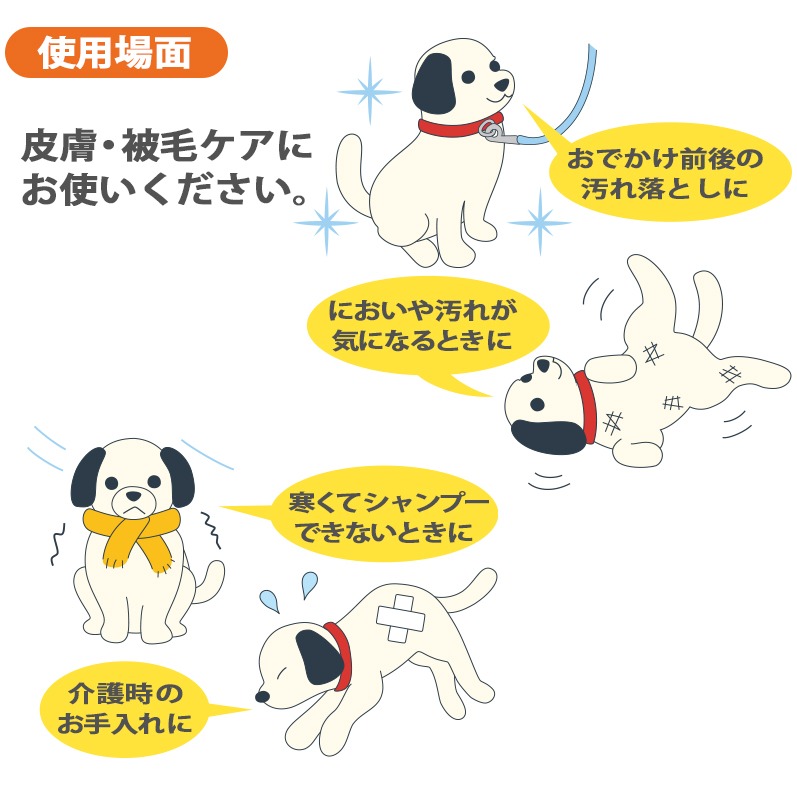 ◇拭き取るだけで汚れを落とし、コラーゲン、ヒアルロン酸の保湿成効果で皮ふ・被毛がしっとり潤います。