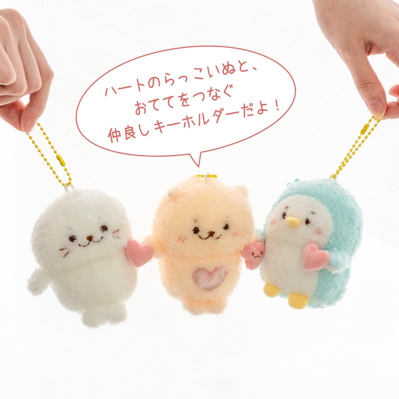 両手に磁石が入っていて、ハートのらっこいぬと、おててをつなぐ仲良しキーホルダーだよ
