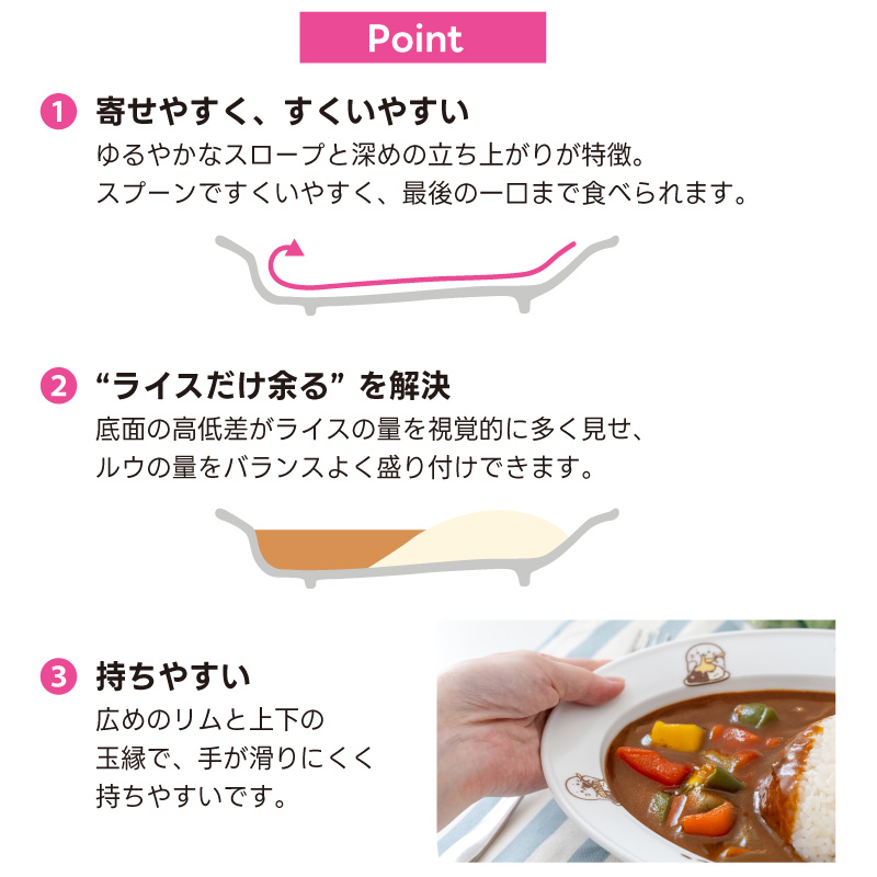 ゆるやかなスロープと深めの立ち上がりが特長。スプーンですくい易く、最後の一口まできれいに食べられるよ♪