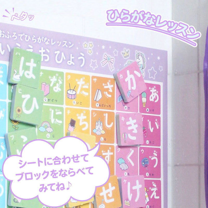 お風呂で楽しくひらがなレッスン あいうえお表に合わせたり、ことばを並べてひらがな遊びを楽しみましょう。ぬらして浴室の壁や浴槽に張り付きます。お風呂の時間が待ち遠しい