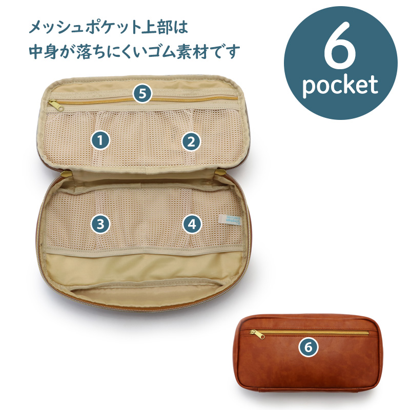 ・内ポケット:ファスナー付き1つ(平ゴムの仕切りあり)、メッシュポケット4つ