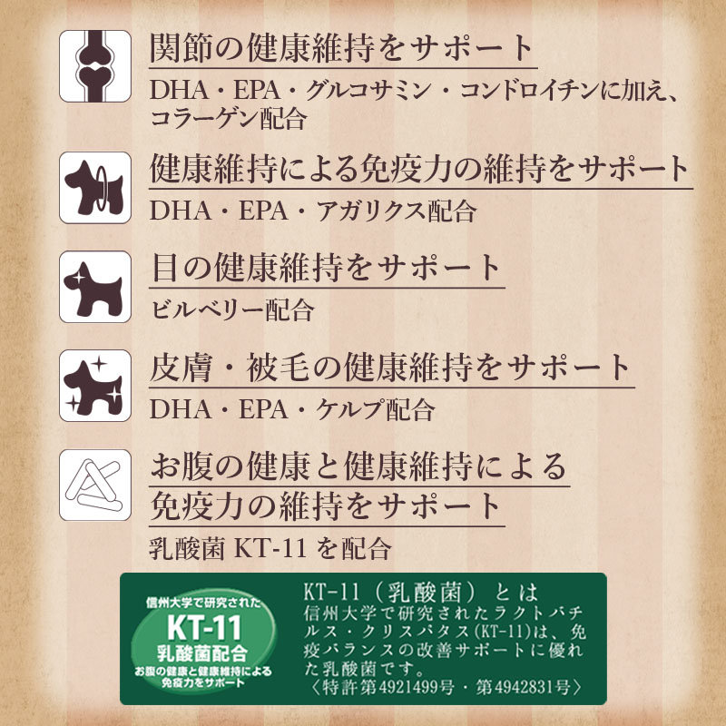 年齢とともに気になりやすい体調変化に配慮し、関節・免疫・目の健康維持を食事面から支える設計とするとともに、