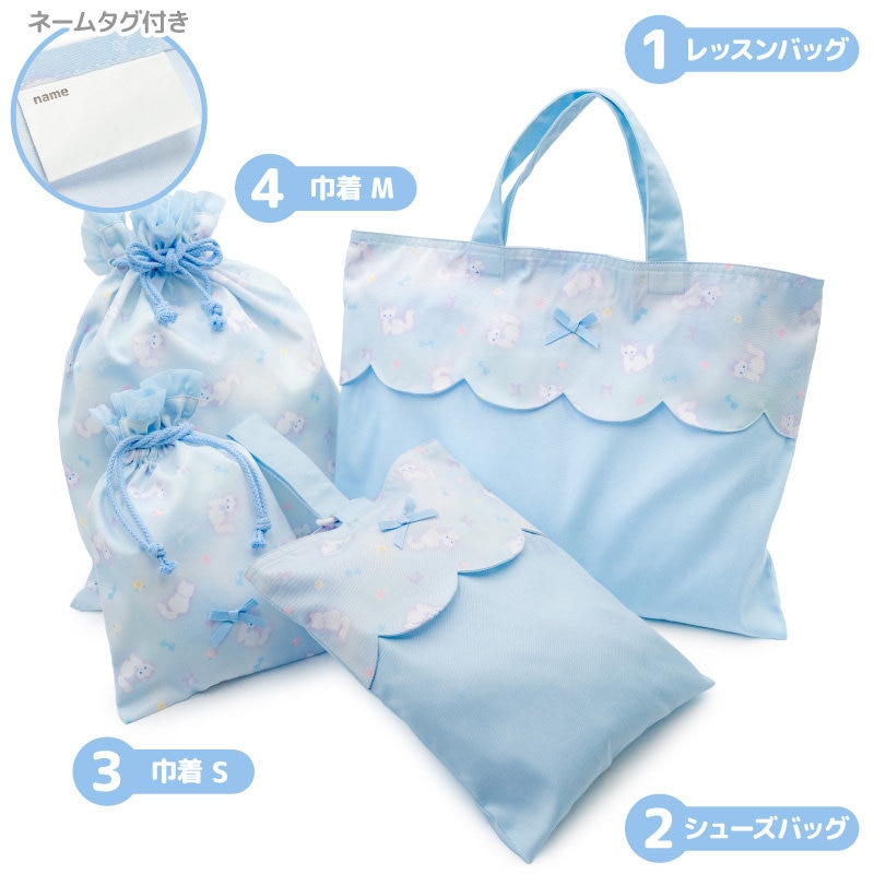 ネット店だけの通園通学4点セットに、限定柄(ふわねこ柄)もご用意しました。はじめから“ちょうどいい”セット。レッスンバッグ、シューズバッグ、巾着S&Mサイズ。