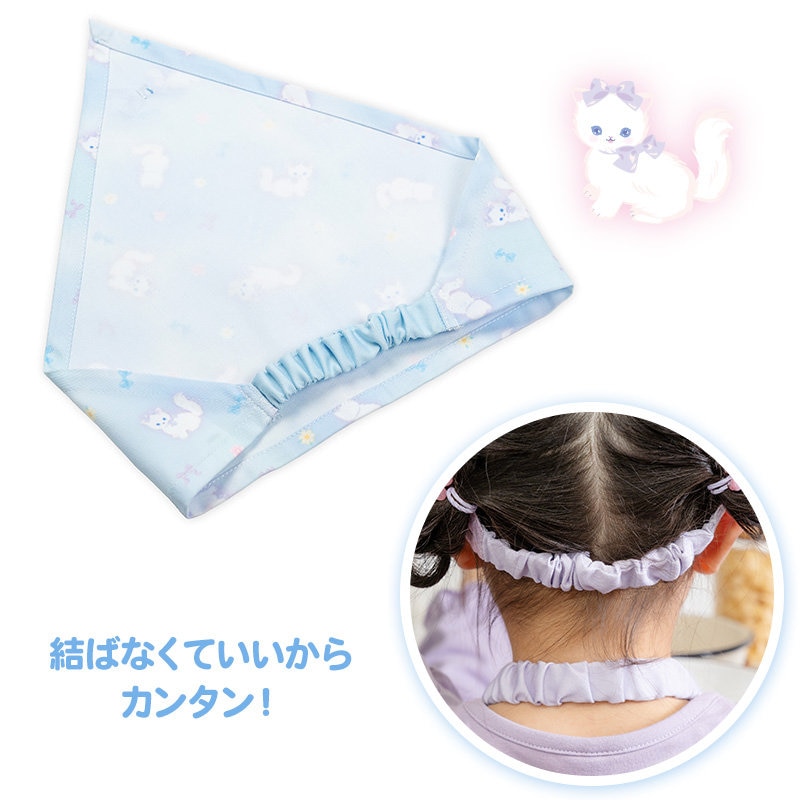 三角巾は、ずり落ちにくいゴム仕様で、すっぽりかぶるだけ。