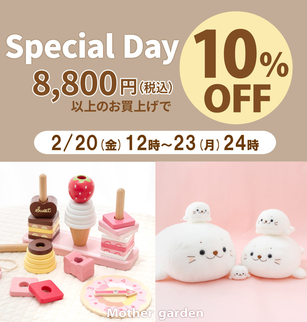 マザーガーデンでは、木のおままごとキッチンセットや着せ替え人形などの知育玩具、ランドセルカバーやリュック、水筒などの学童用品、「しろたん」や「らっこいぬ」などのキャラクター雑貨を販売しています。